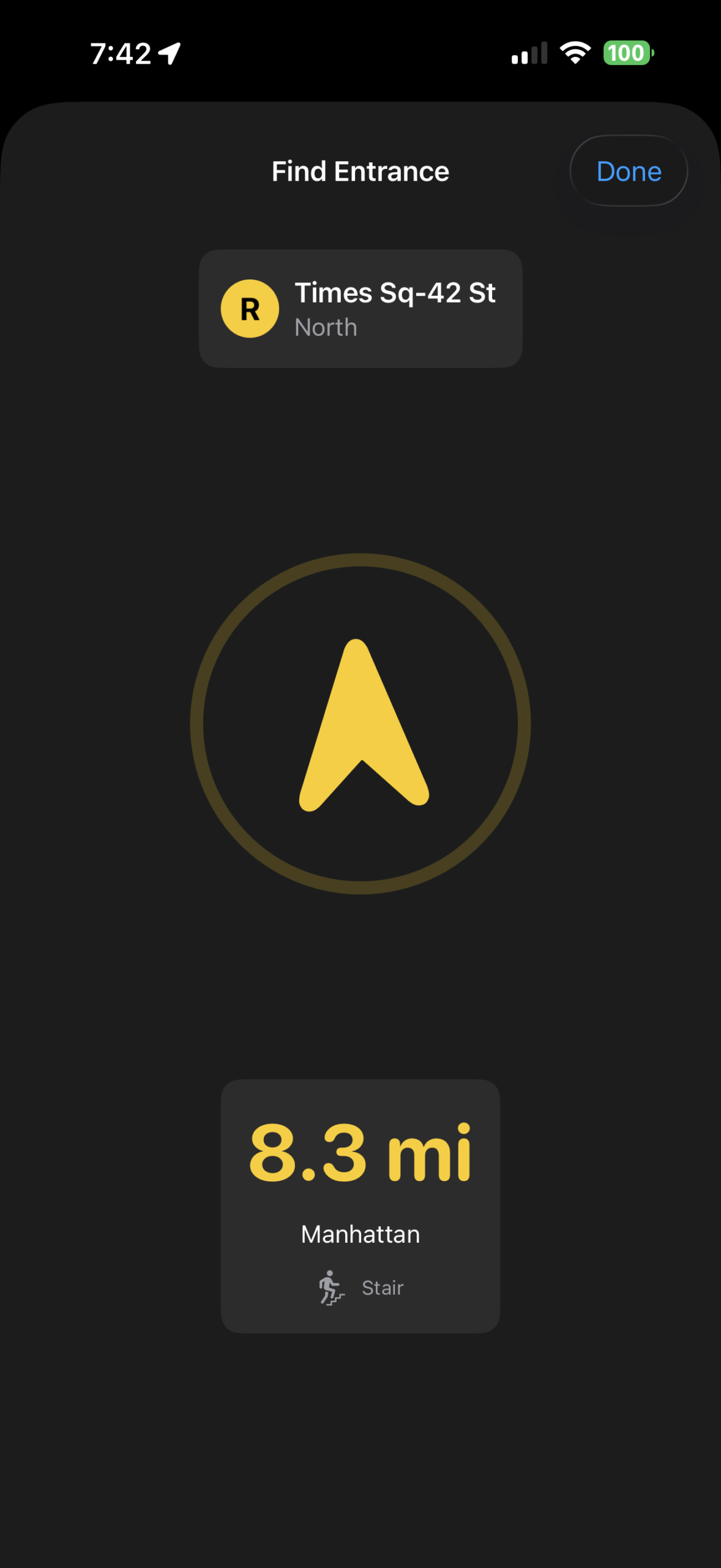 You might notice something else there, by the way. Yesterday I was thinking, "It'd be really cool if you could get an arrow that pointed you to the nearest entrance for a route." As it happens, the MTA provides coordinates for the entrances. So you tap "Find Entrance," and...