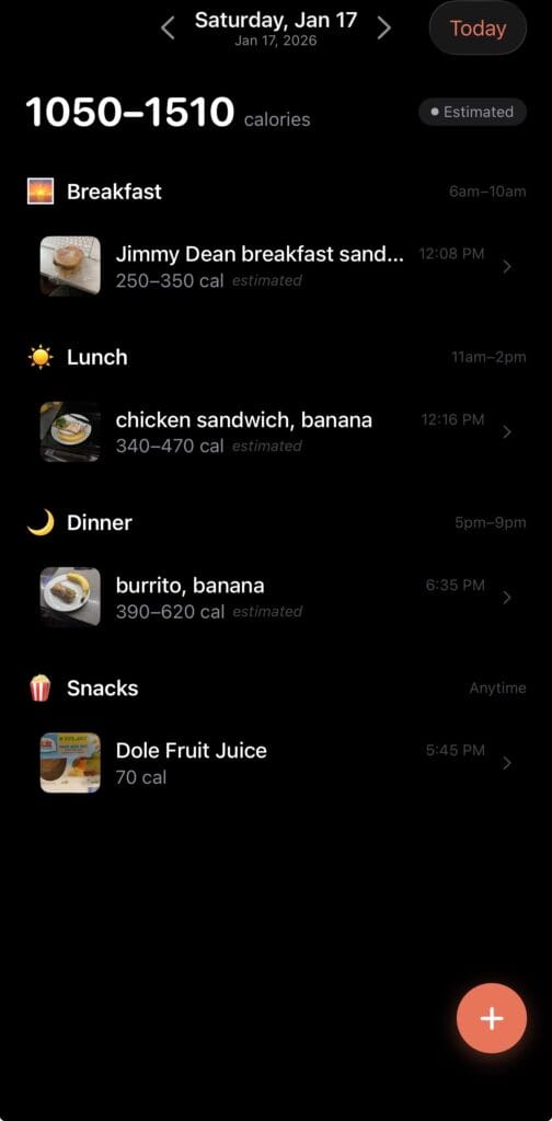 I'll spoil the surprise: the next project I intended to work on was something tentatively called Intake. Simple meal tracker. Take photos, enter text with a photo, or just enter a text description. Track your breakfast, lunch, dinner and any snacks. It's not meant to be exact — just meant to ballpark where I'm at.
